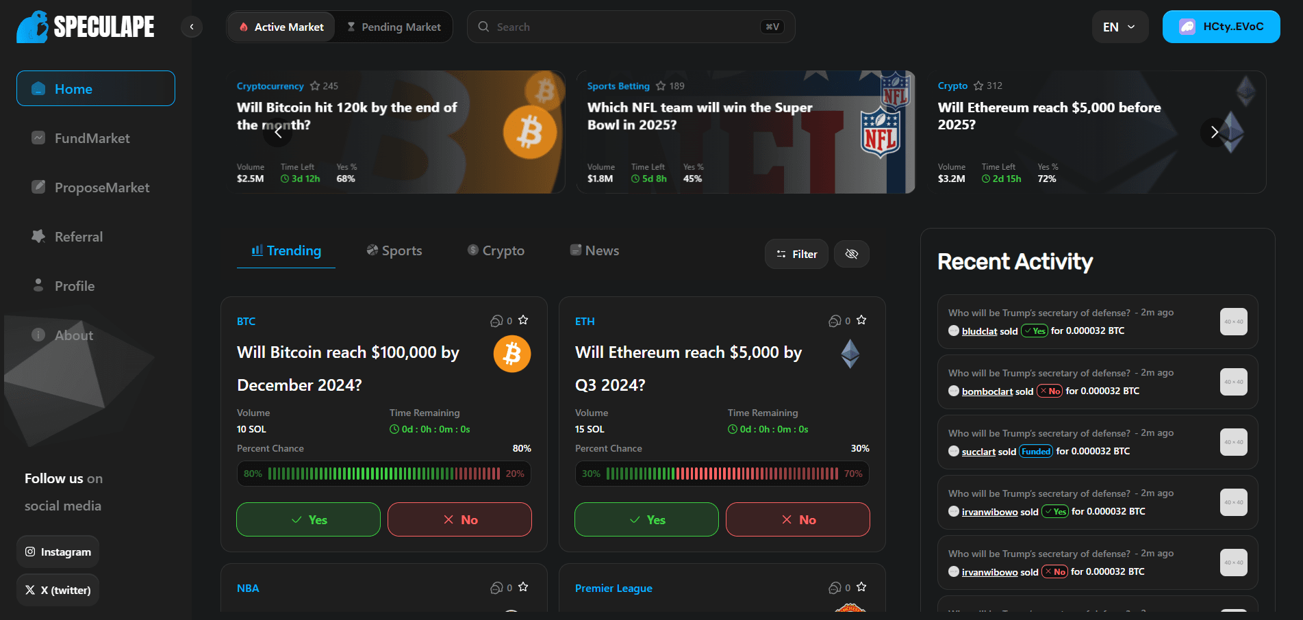 Speculape is an online Prediction market platform that combines web3 technology with our state-of-the art gaming platform to provide a secure and immersive experience for players all around the globe.